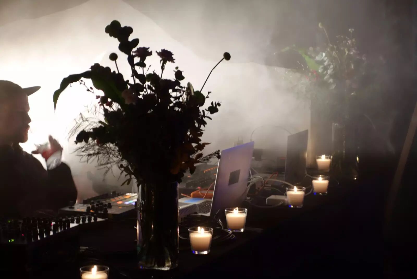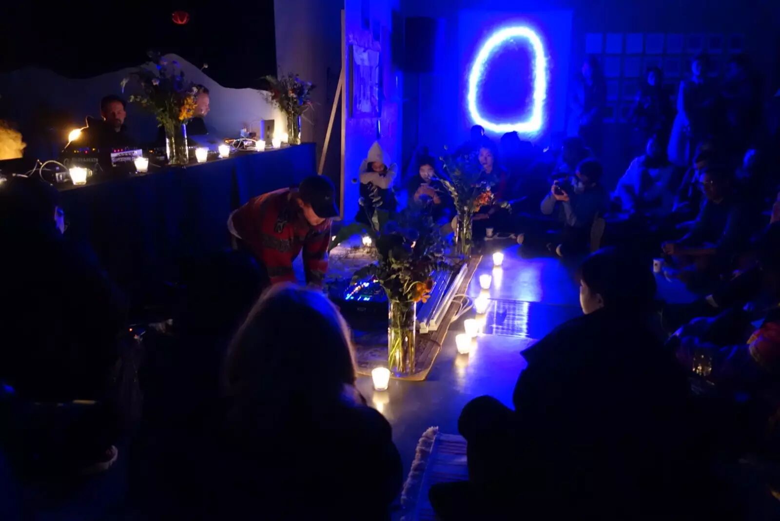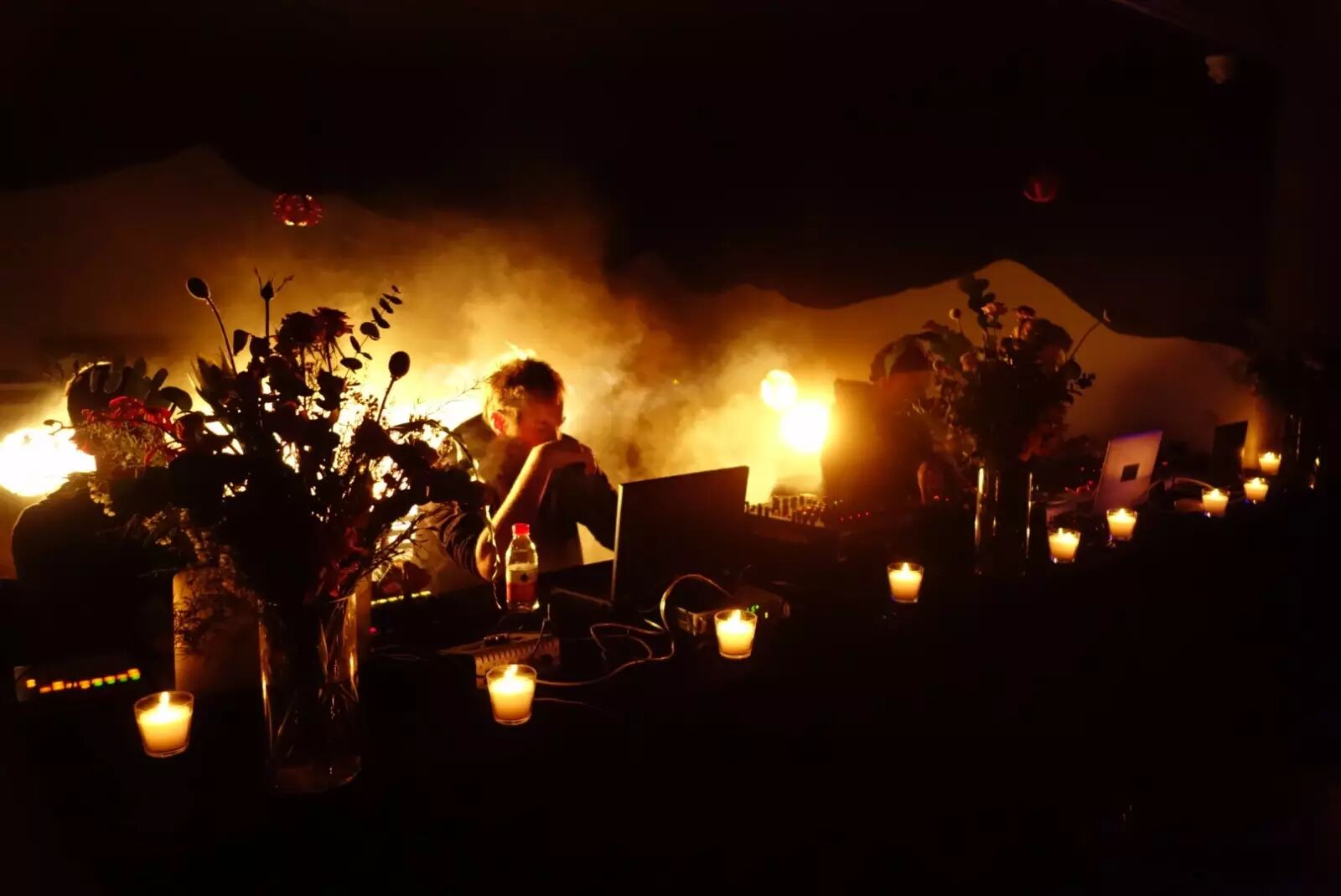 我找到一个侧边的缝隙,终于得以一窥“祭坛”的详态:在Tabula Rasa Gallery原有的黑色小展厅内,面向观众支起了盖着黑布的长桌,四位giegling成员坐在桌后,面对着桌上他们的电脑和调音设备。除此之外,桌上还摆放了一长排蜡烛以及几束饱满的鲜花,偶尔会飘散起淡淡的香气。忽明忽暗的黄色灯光和烟雾缭绕的干冰从他们身后升起,场景之神圣仿佛“最后的晚餐”。在长条桌的前方地面,还有一方铺在地上的波斯地毯,地毯四周同样是鲜花与蜡烛围绕,一位音乐人跪在其中制造音乐,像是在主持一场献祭。现在,正是他的表演时间。