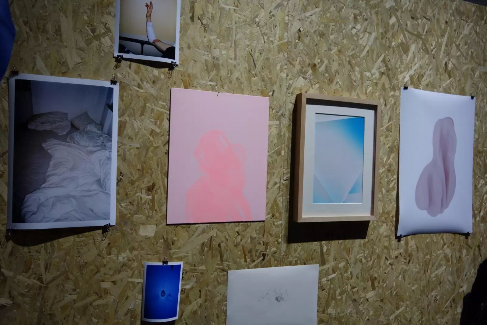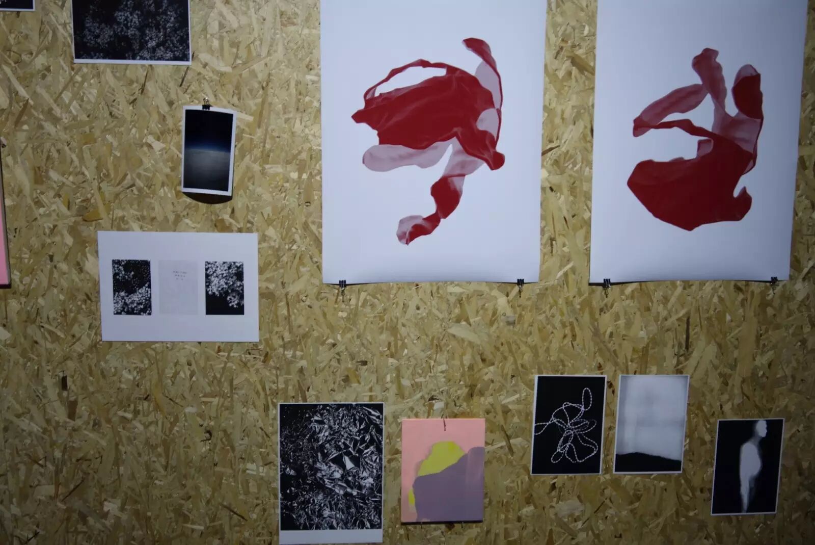 腰椎的酸痛提醒我也许是时候走动走动了,整个场地四周似乎也有什么影影绰绰的东西在吸引我的注意。我绕到场边,借着偶尔亮起的光线可以看到,四周的活动木板墙上挂满了绘画、摄影和装置作品。它们大多由简易的材料制作,看起来并不是什么多么严肃的作品,但每一件都关于一个好点子。比如视觉上非常吸引人、呈现效果像是抽象绘画的摄影作品、对自然生活观察入微的系列摄影、描摹细致又大量留白的绘画以及可供观众进行互动的充满幽默感的装置。观看着这些作品,我一边体会着,音乐以及视觉艺术创作可以在多大的程度上通感,一边在想:这绝对是一群极有天赋的年轻人。