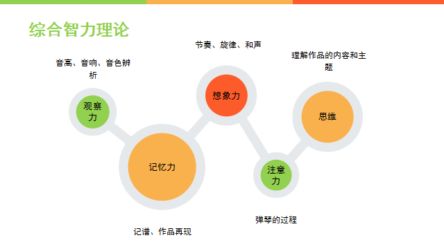 美国加州大学的加德纳教授提出了一种“多元智力理论”其中“音乐节奏智力”是对音高、音响、音色的敏锐感知能力和对节奏、旋律与音乐形象的准确把握和理解能力。 音乐节奏智力的表现领域为:歌唱、演奏、作曲、指挥、评论和音乐欣赏。当你在进行着钢琴演奏技能训练(如节奏训练、音阶训练等)的时候,用“心”感受到上述弹奏的结果,即音感、乐感、节奏感、旋律感、美感等的同时你就是在进行着音乐节奏智力训练。