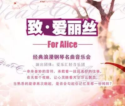 “乐圣”贝多芬谱写的《致爱丽丝》可谓是世界古典乐曲中的经典,旋律曼妙、动人。生活中,大到各古典音乐演奏会,小到街上的每一角落,它无处不在。当旋律响起时,焦躁的心渐渐沉浮下来,脑海中当即浮现一个女孩身影,感受着她对这世界洒下的爱和关怀,享受着旋律带给心灵的片刻安宁。另外再提醒一下,本场演出正在进行抢票活动【福利】 0元听经典浪漫钢琴名曲音乐会大家一起来试试吧,可能你就是那位幸运儿。