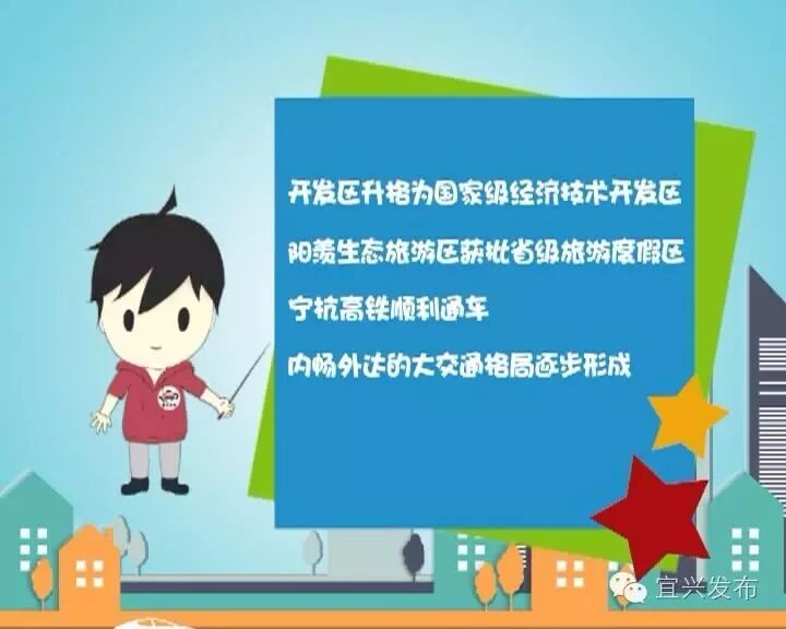 除了上面说的这些,我还有很多喜事想和大家一起分享,开发区升格为国家级经济技术开发区、阳羡生态旅游区获批省级旅游度假区、宁杭高铁顺利通车,内畅外达的大交通格局逐步形成。怎么样,对我这几年的成绩可还算满意?是不是觉得现在的我,金光闪闪,自信满满呢,相信在未来的道路上,小兴我的前途无量哦,我还会继续努力的,一起来期待我变得更强、更富、 更美、更高吧。
