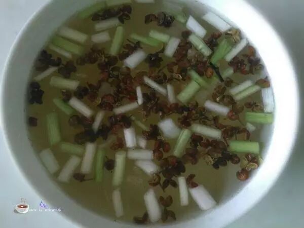 将生姜片、葱段、花椒放入烫水里泡一个小时,然后将这个水过滤出来待用,这就是制作好的葱姜花椒水