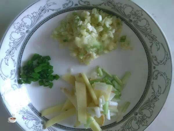 生姜一部分切成末、一部分切成片;香葱一部分切成末,一部分切成段