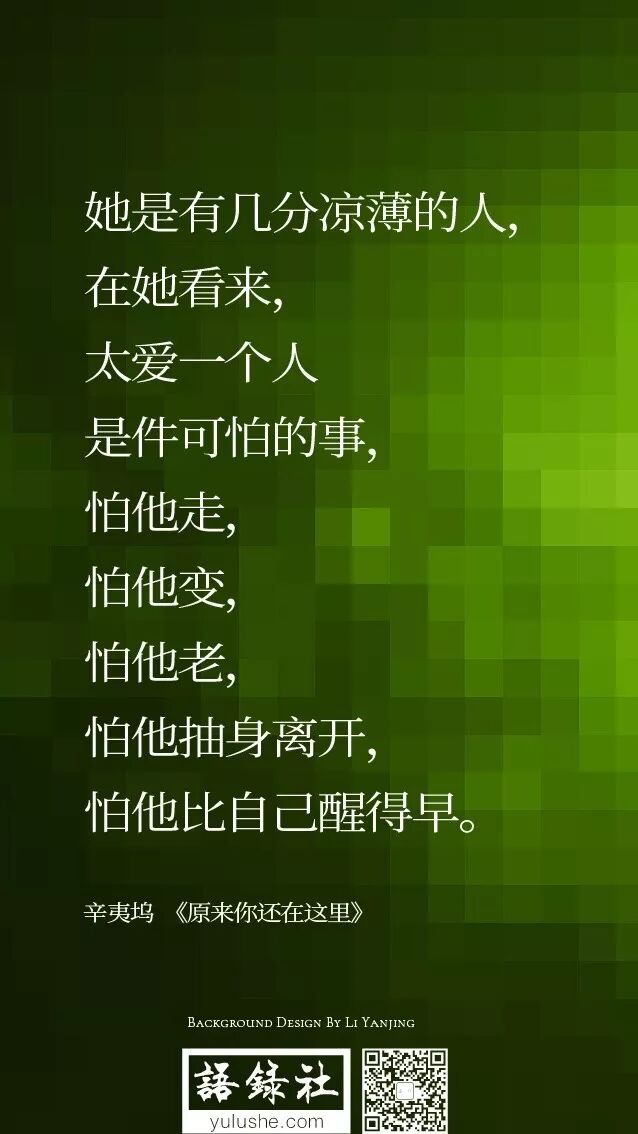 她是有几分凉薄的人,在她看来,太爱一个人是件可怕的事,怕他走,怕他变,怕他老,怕他抽身离开,怕他比自己醒得早。