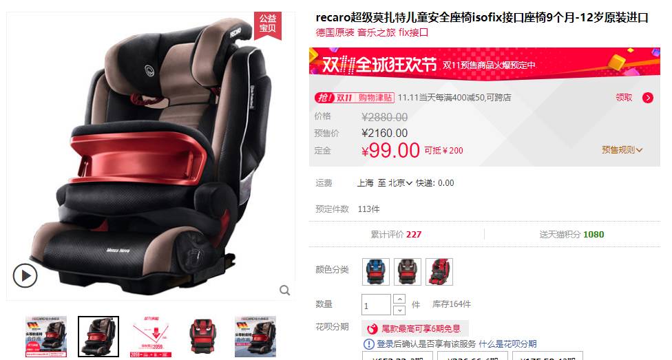 这款在RECARO天猫旗舰店享受99元抵200的定金优惠,到手2059元,咱们团购直接打折——只需要1880元!!